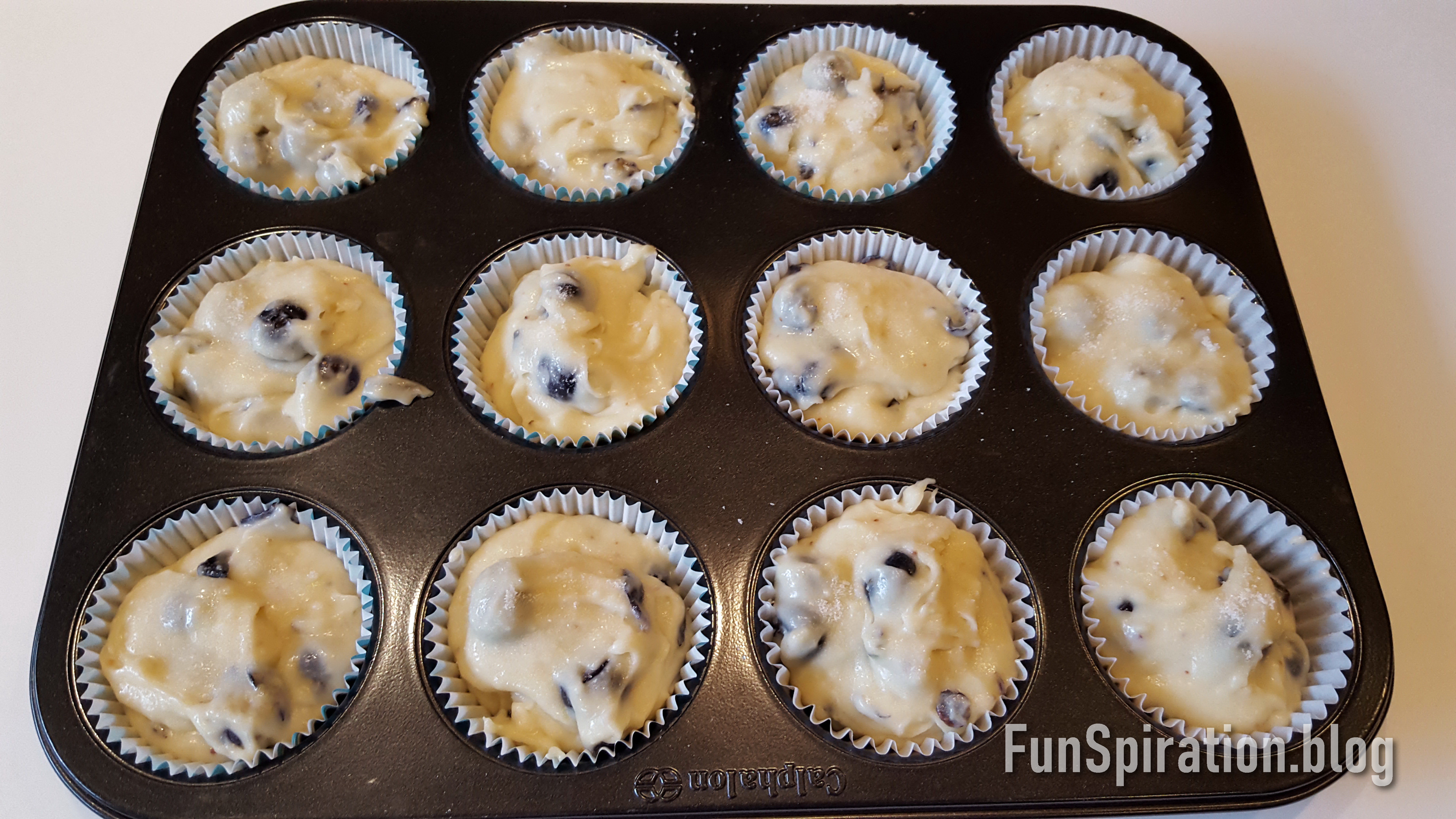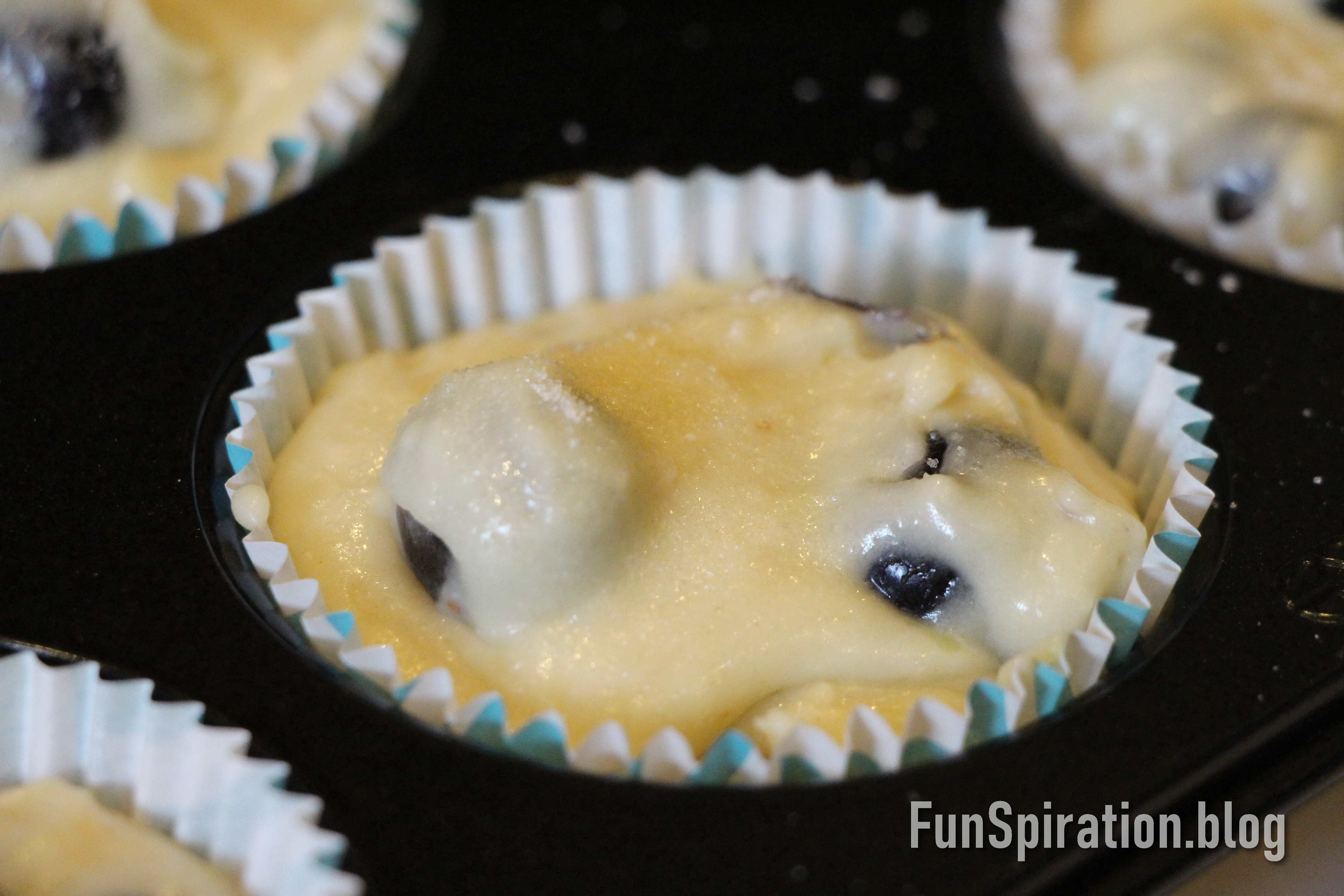 Add ½ of flour mixture and half of milk at a time and mix on low speed for 5 seconds each time then add all of the blueberries and mix for about 10 seconds to combine everything (Careful to NOT over mix or it will make muffins tough and bakes unevenly) Fill batter evenly in lined muffin pan and sprinkle a bit of the 1-2 teaspoons of granulated sugar over each top of the muffin.