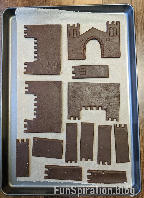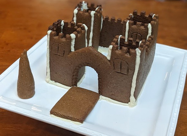 We practiced our sketches during family art time. My talented husband finalized the idea and made a prototype out of stock paper with the kids. Made the dough, put the pieces together for the kids who did the decorating with very little help with the icing for glue. We love this castle – it’s fun, it’s cute and mainly because we did it together!