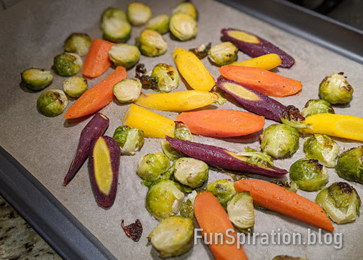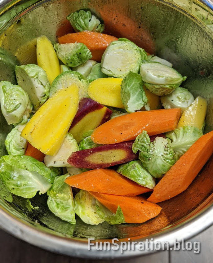 - Wash and prep vegetables – peel carrots and cut diagonally into 3-4 inch pieces. Trim brussel sprout’s outer stems, remove yellow/blemish leaves and slice in half lengthwise through the stem.